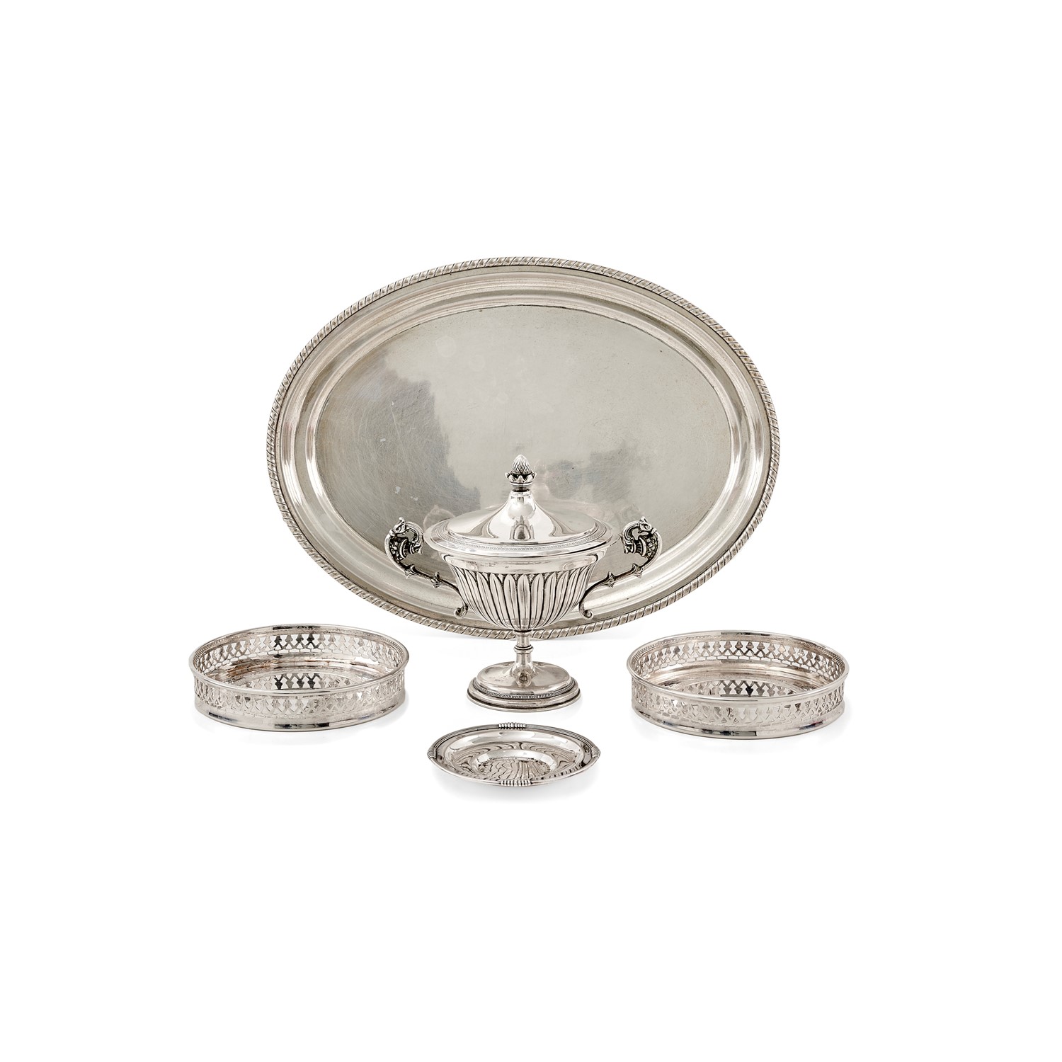 composto da vassoio ovale, zuccheriera, piattino e due sottobottiglia.