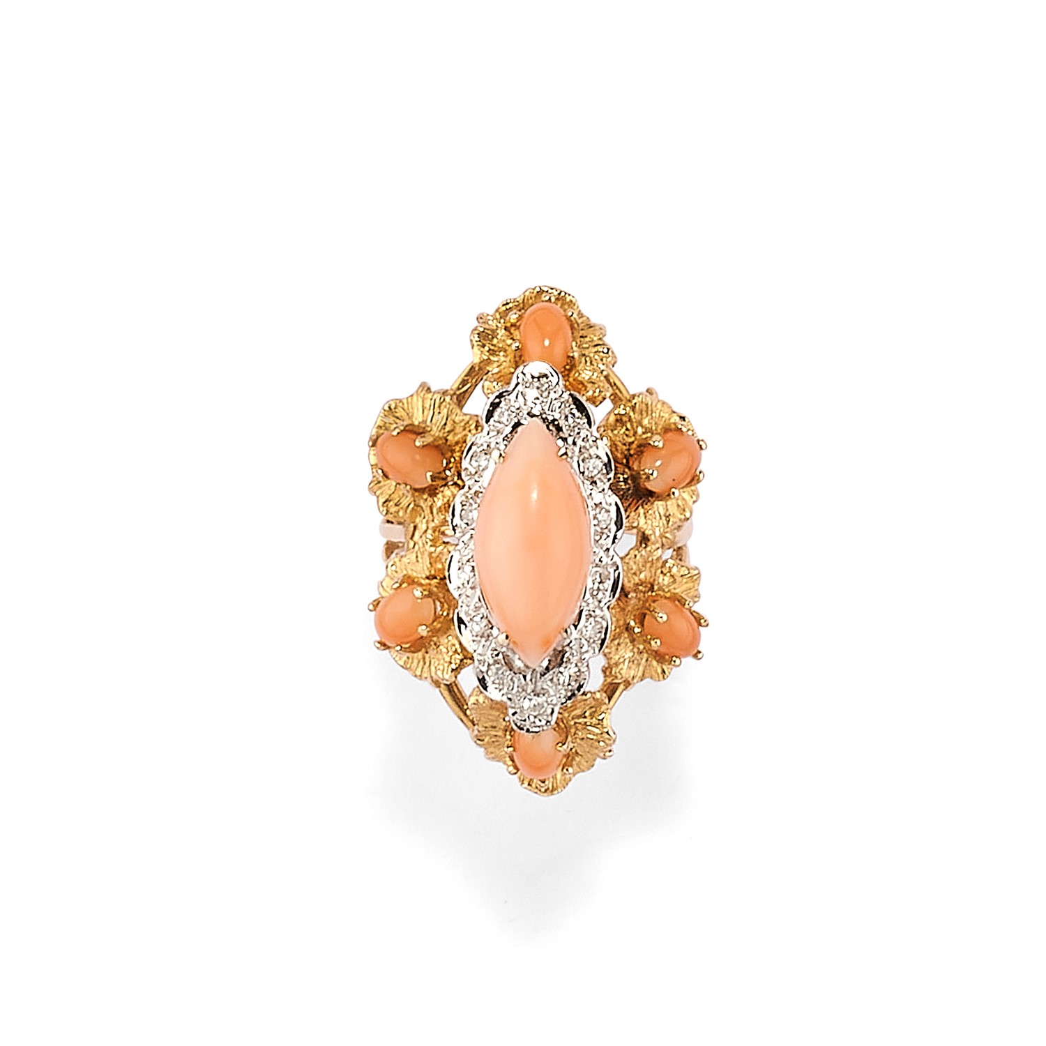 in oro giallo 14K, con corallo rosa taglio navette cabochon e diamanti taglio brillante.