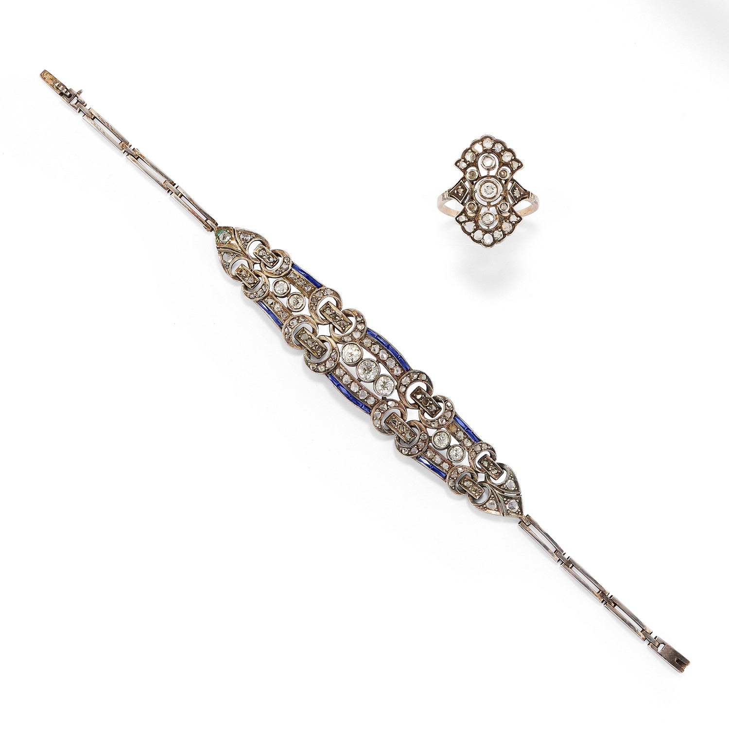 in oro 18K, argento, diamanti taglio vecchio e rosa, zaffiri taglio baguette.