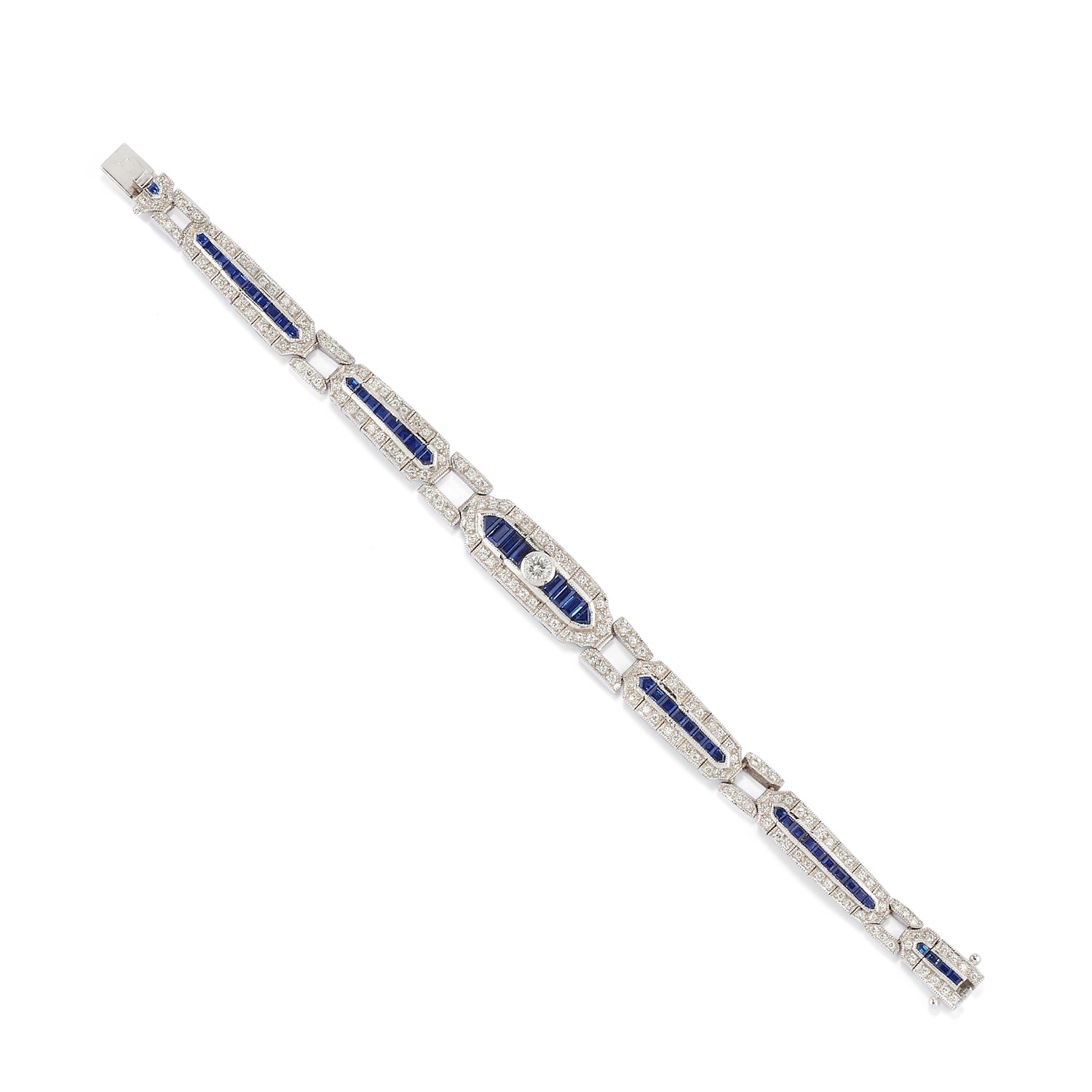 in oro bianco 18K, interamente decorato con diamanti taglio brillante per totale ct 5,00 circa, al centro diamante taglio brillante di ct 0,20 circa e motivi in zaffiri taglio carré.