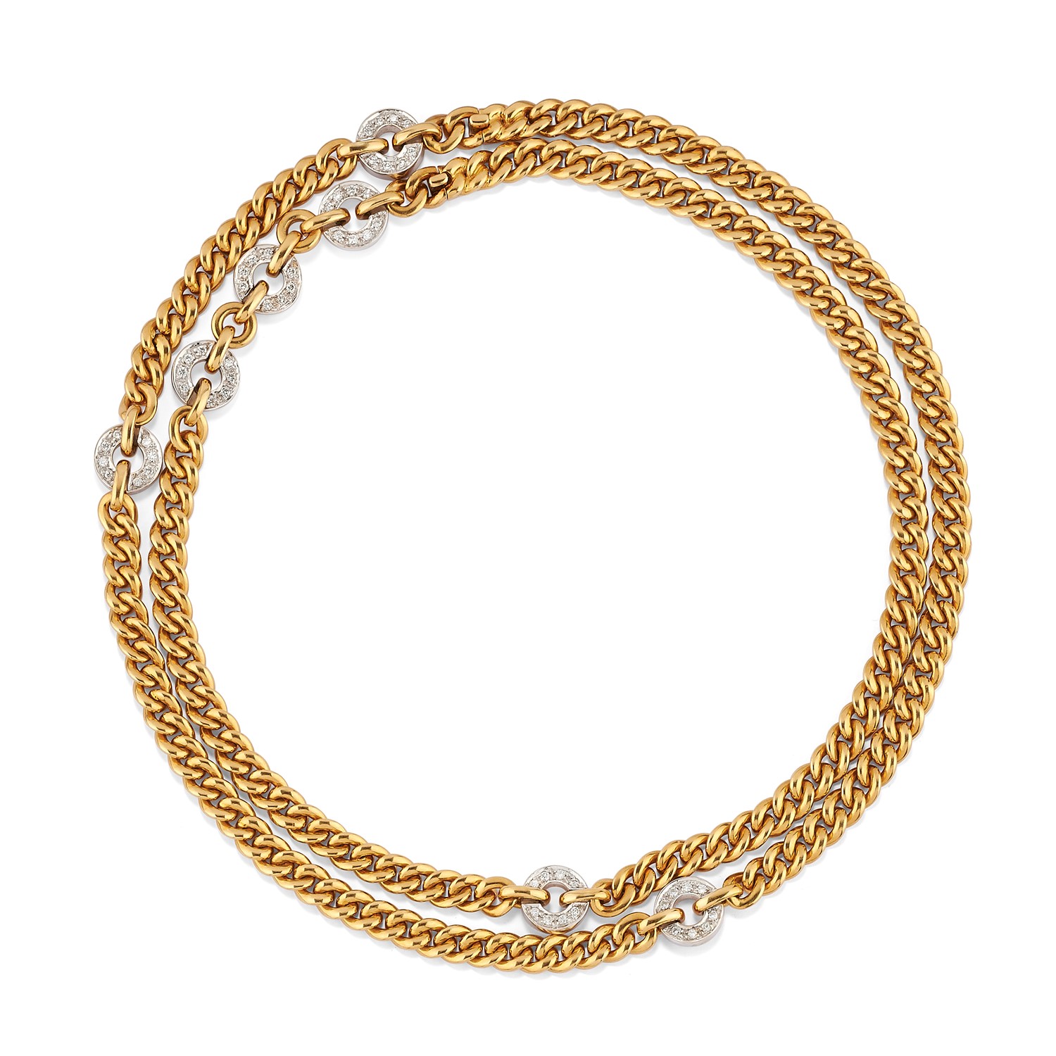 in oro bicolore 18K, a maglia groumette piatta con motivi circolari decorati da diamanti taglio brillante, scomponibile in due collane.