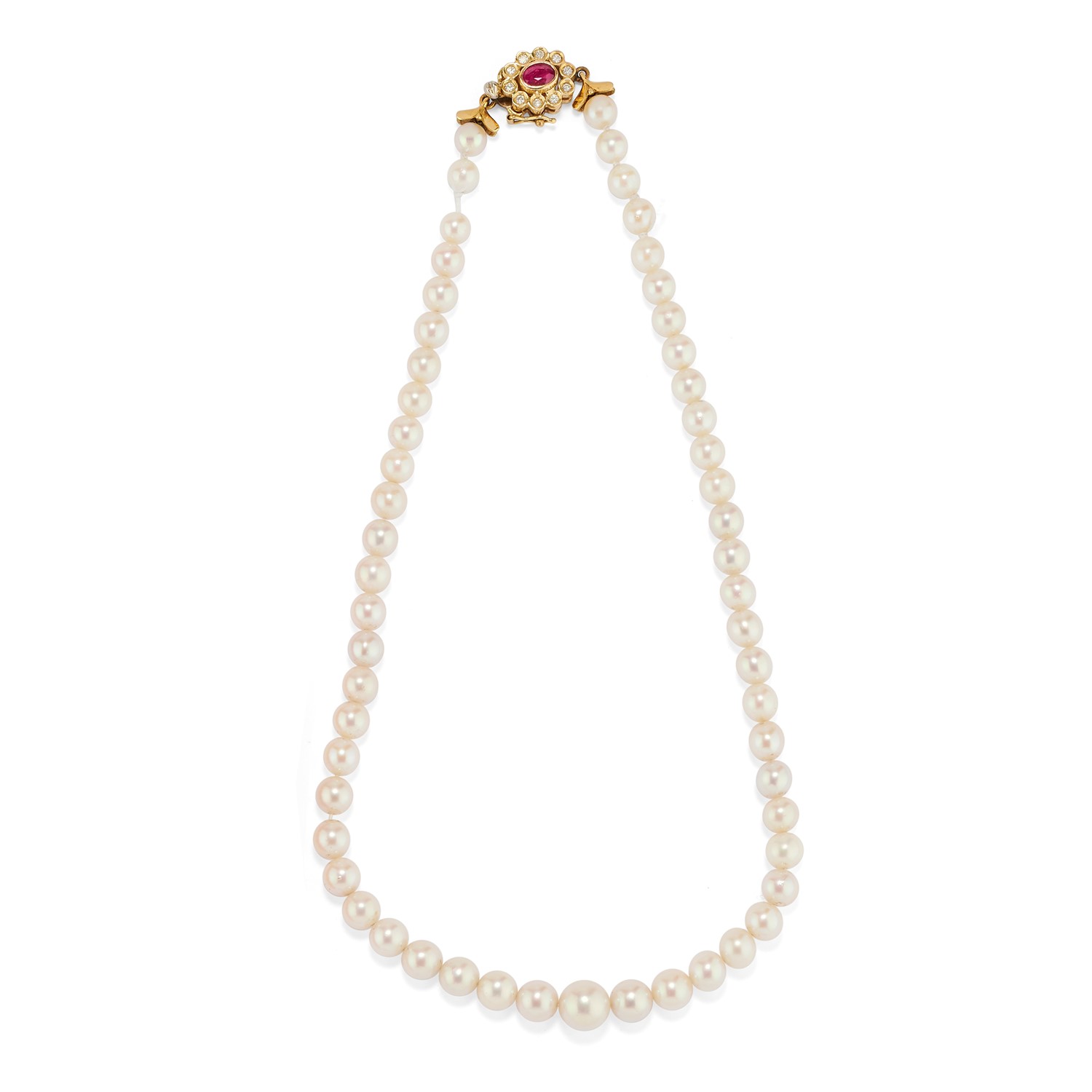 in oro giallo 18K, ad un filo di perle coltivate disposte a degradé di mm 8,50-5,50, rubino e diamanti, chiusura con perno e farfalla, (collana da rinfilare).