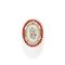 in oro giallo 18K, di forma ovale con decoro floreale in smalti policromi e contorno in rubini taglio rotondo.