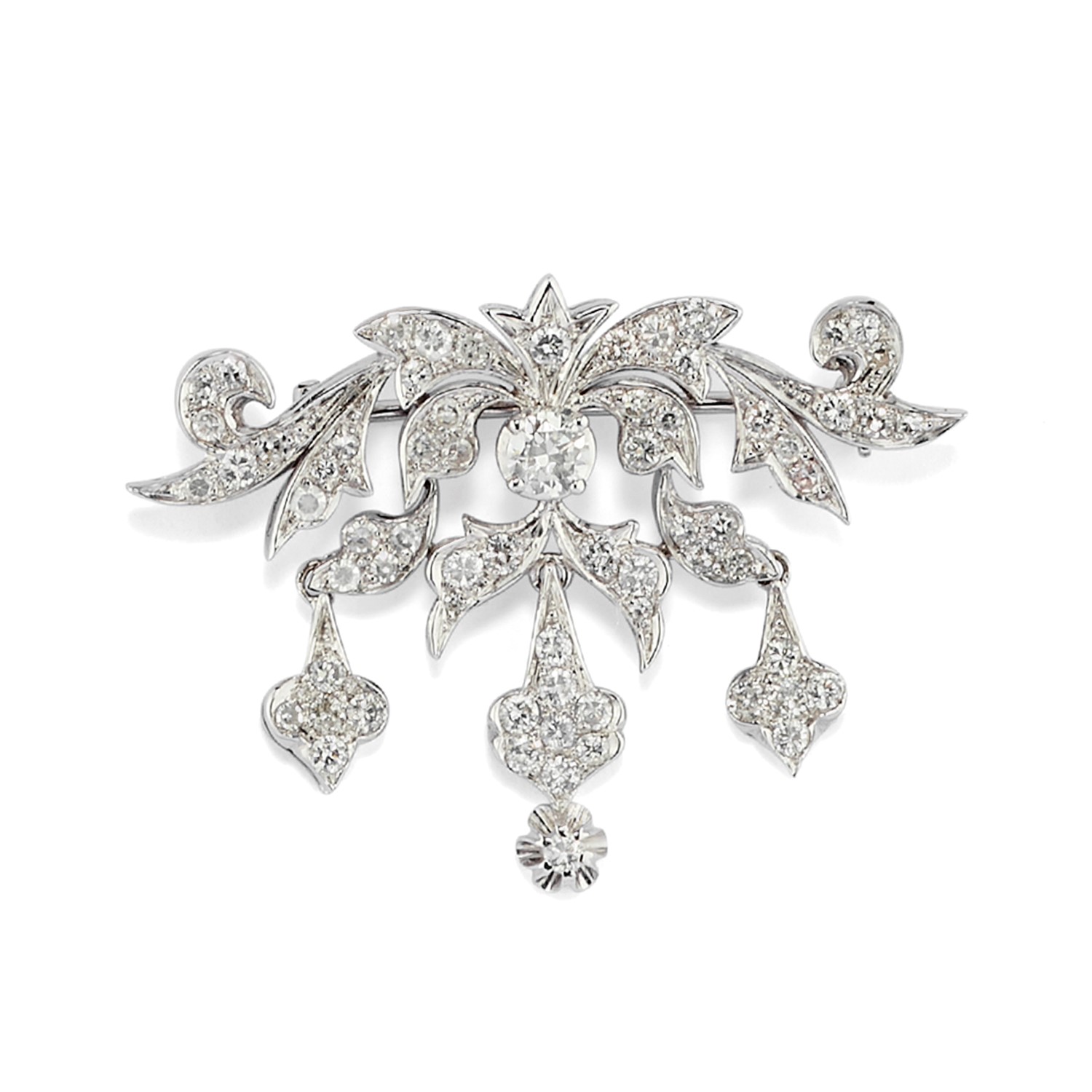 in oro bianco 18K, diamanti taglio brillante per totale ct 2,30 circa, motivo a racemi con tre pendenti.