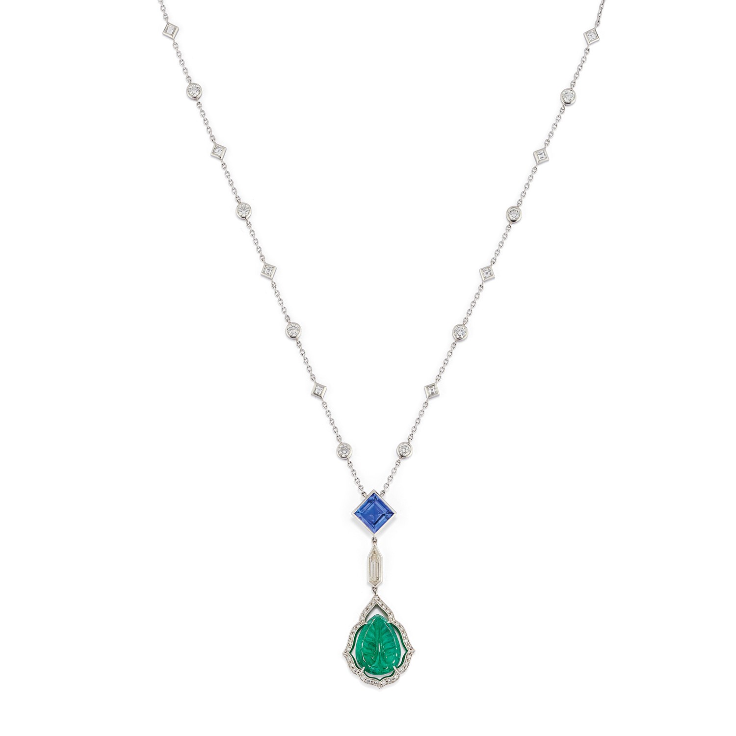 in oro bianco 18K, con pendente con smeraldo taglio cabochon inciso a foglia di ct 6,10 circa, tanzanite taglio carré di ct 1,90 circa e catenella con castoni in diamanti taglio brillante e carré per totale ct 2,70 circa.
