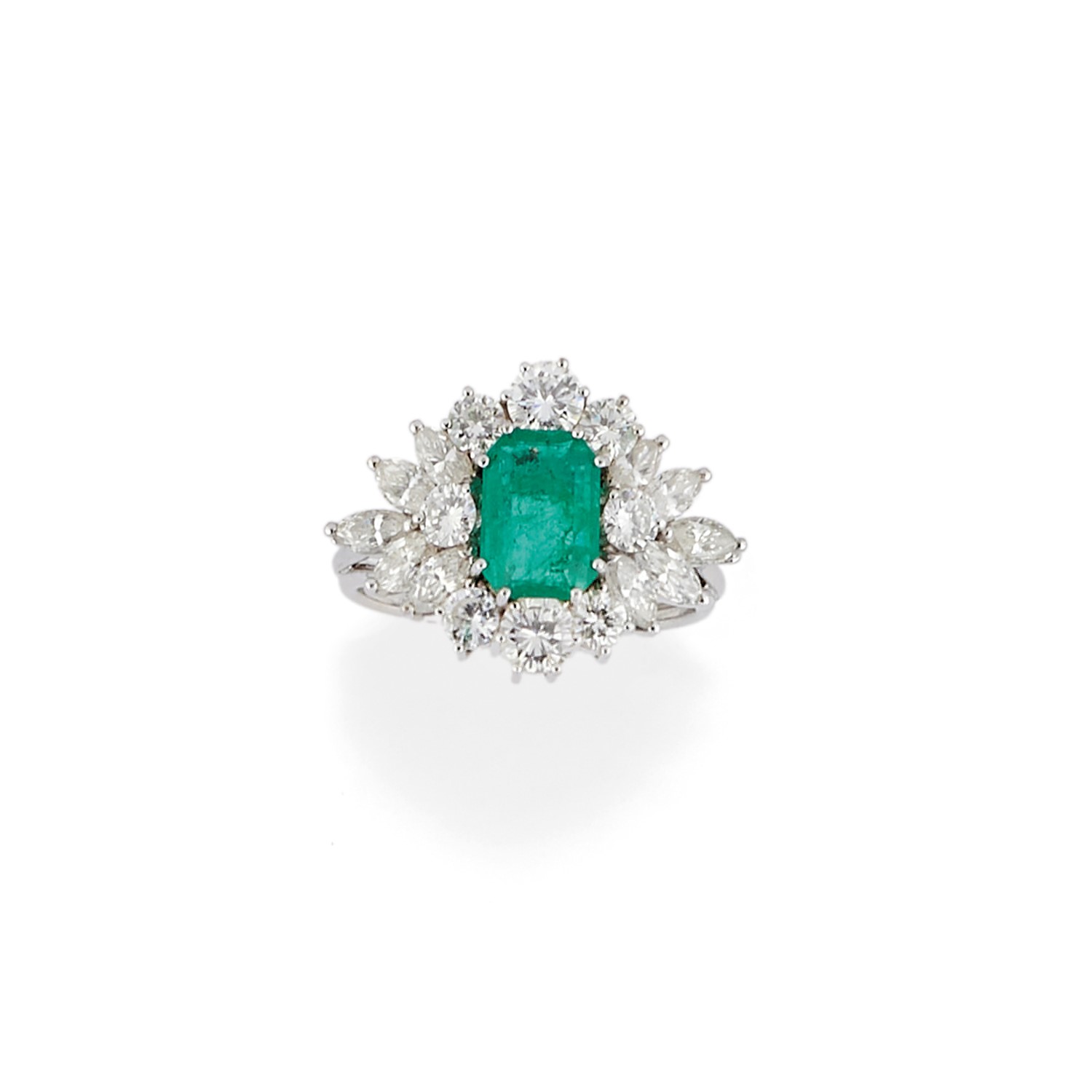 in oro bianco 18K, smeraldo taglio ottagonale a gradini di ct 1,20 circa, diamanti taglio brillante e marquise per totale ct 2,20 circa, prob. colore F/G, purezza VS/SI.