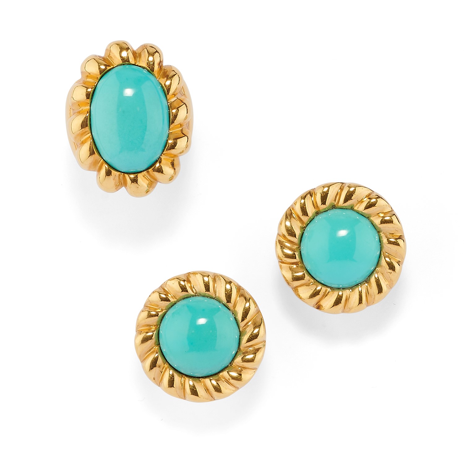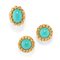 in oro giallo 18K e turchesi taglio cabochon, composta da anello e coppia di orecchini, chiusura con perno e clip.