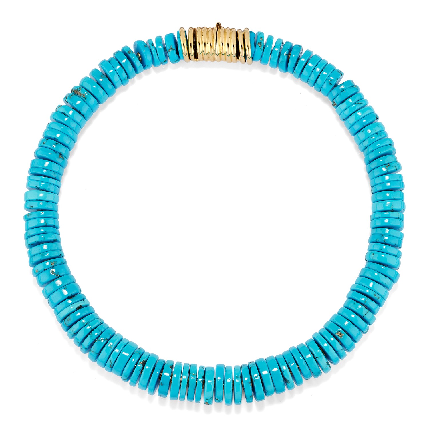 in oro giallo 18K, ad un filo di dischi in turchese da mm 13,50-18,00 circa.
