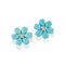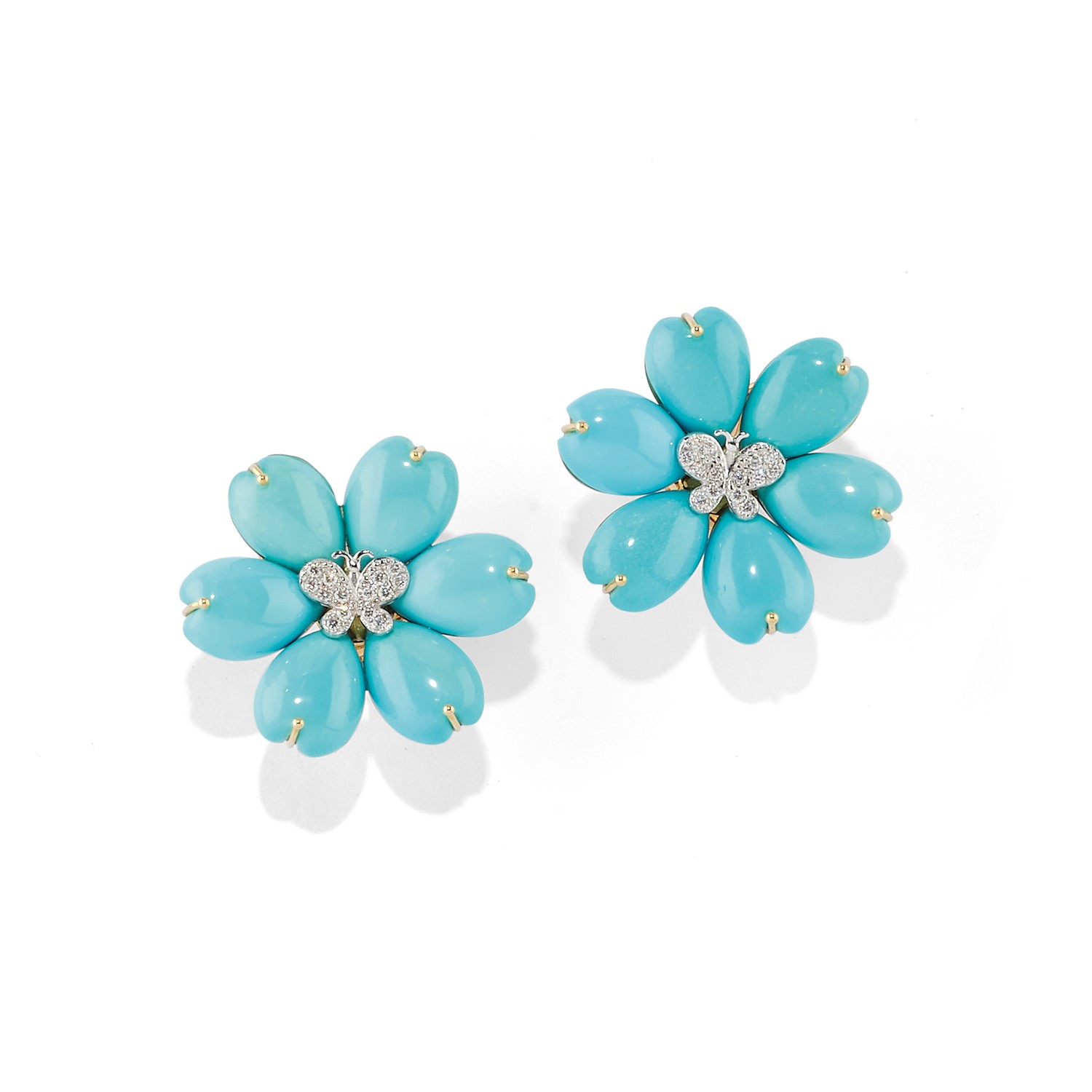 in oro bicolore 18K, realizzati a fiore con petali in turchese taglio ovale cabochon, al centro motivo a farfalla in diamanti taglio brillante.