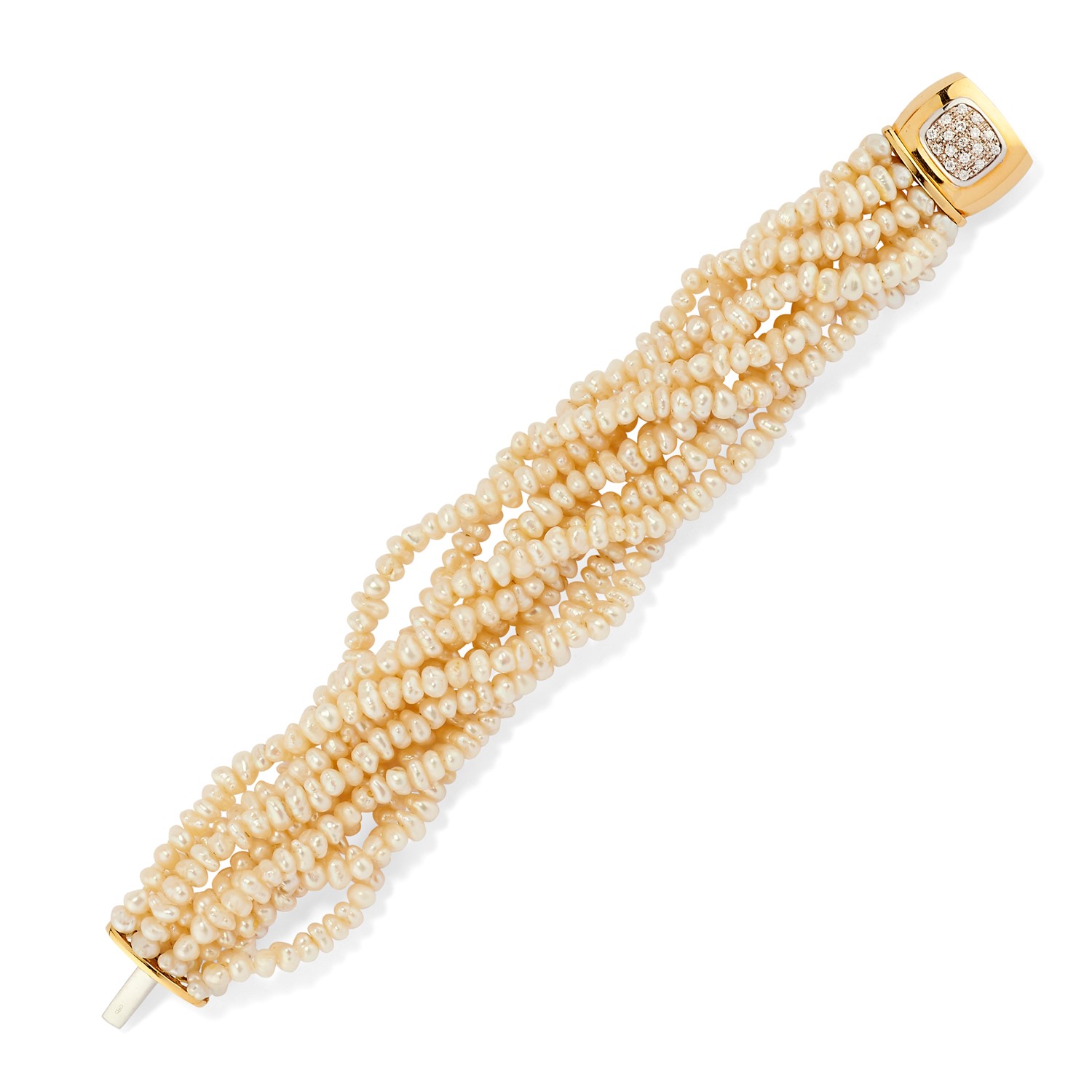 in oro giallo 18K, a nove fili di perle di fiume e diamanti taglio brillante per totale ct 0,40 circa.