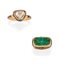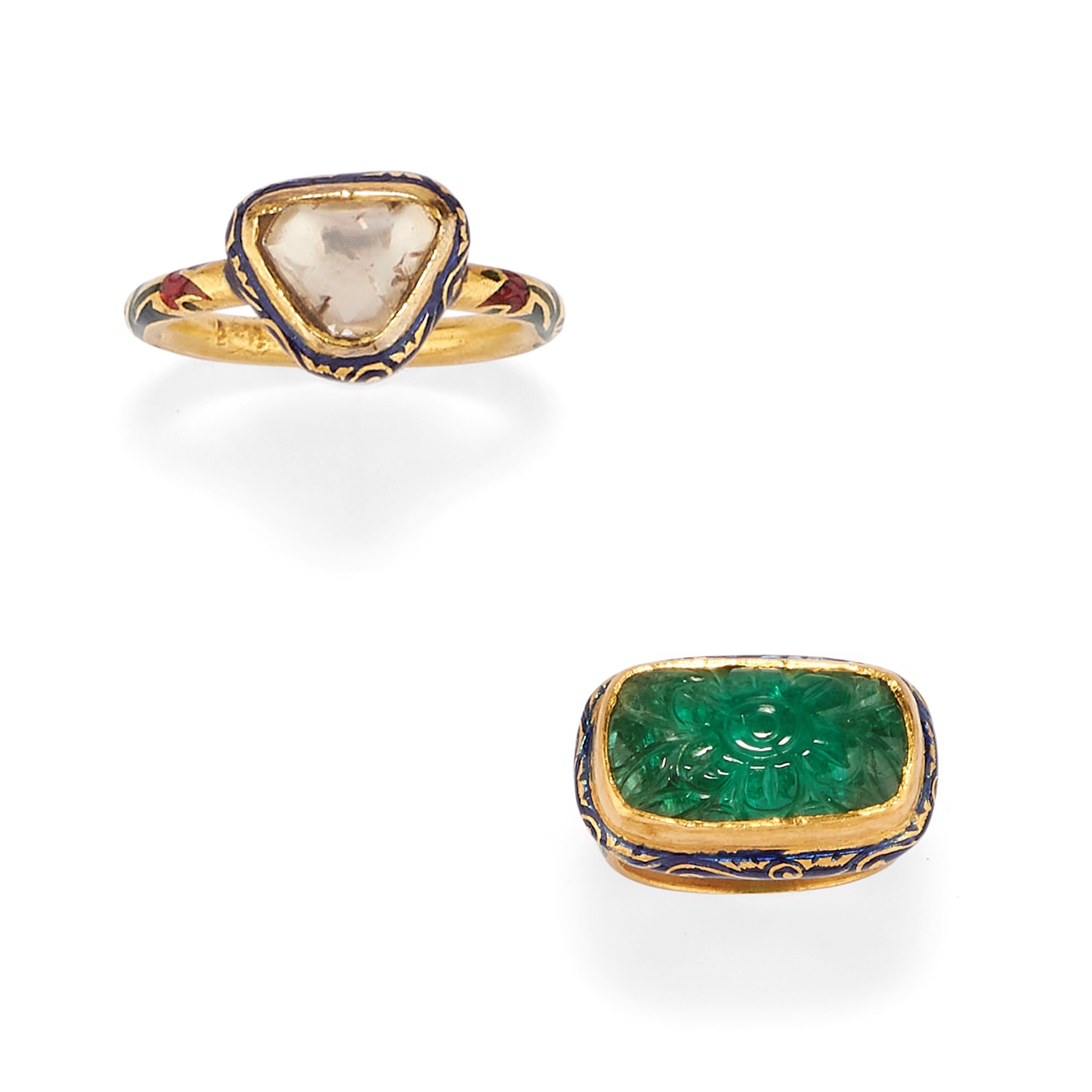 in oro giallo 22K, uno con smeraldo taglio ovale inciso, l'altro con diamante taglio triangolo e smalti policromi.