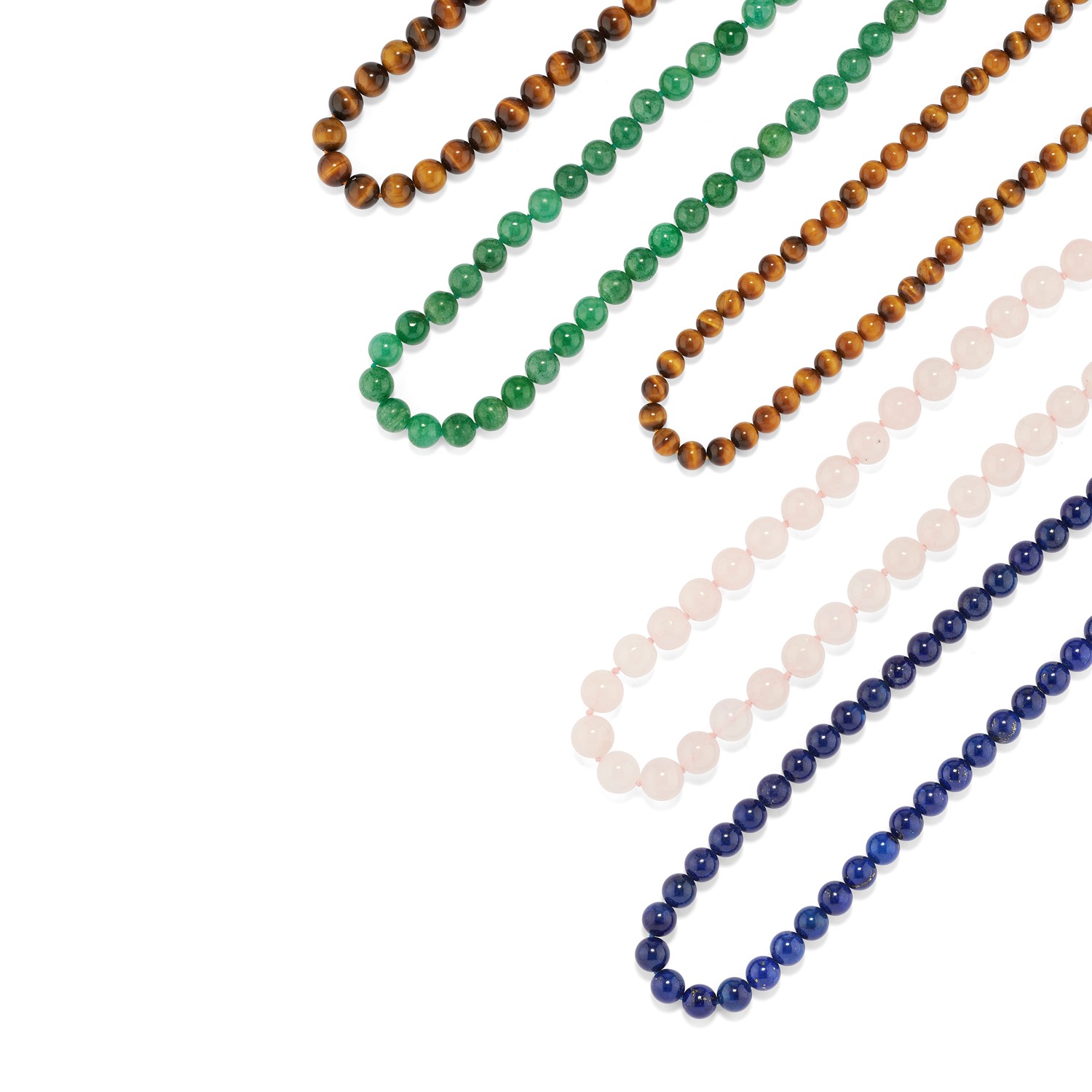 Cinque collane in occhio di tigre, lapislazzuli, giada e quarzo rosa