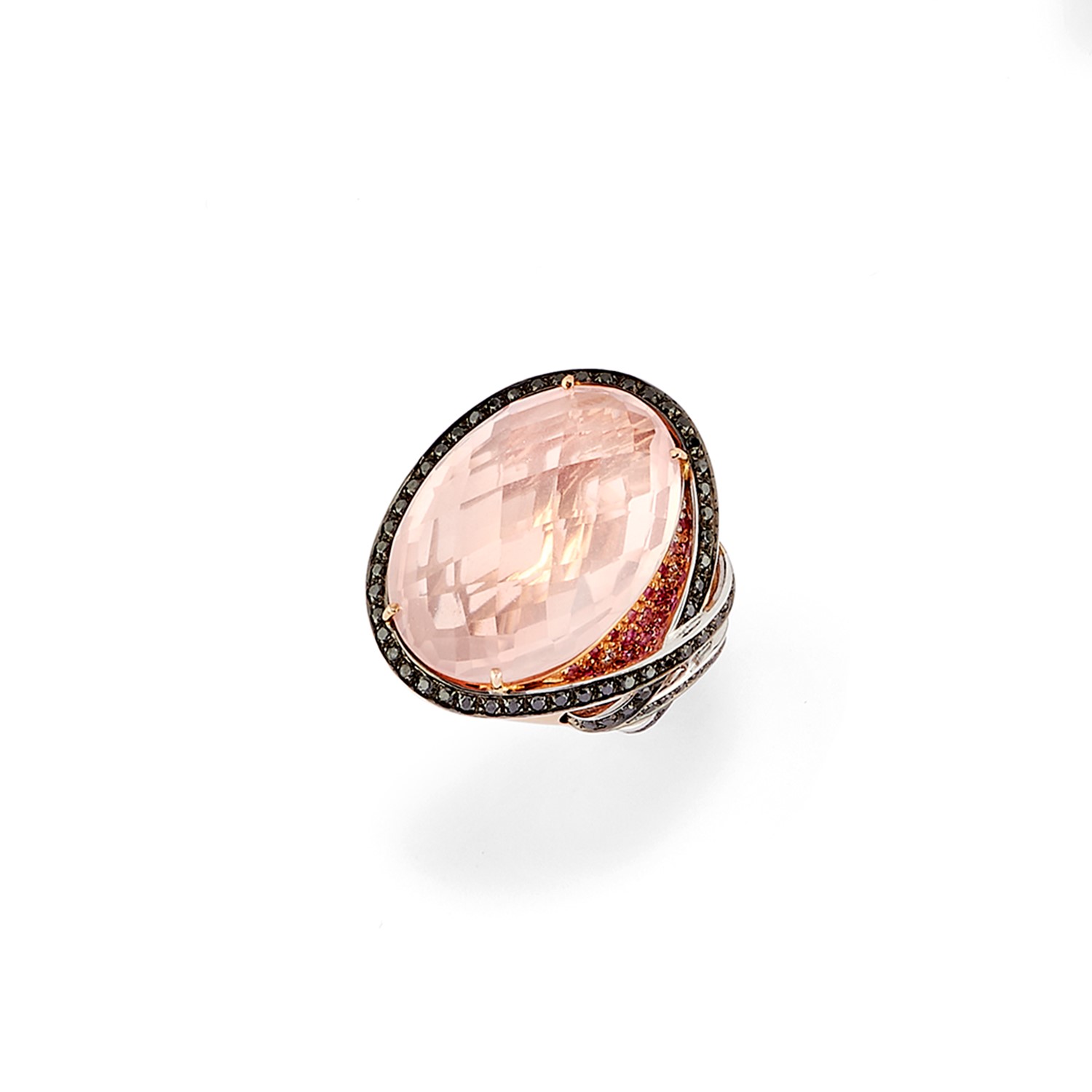 in oro rosso 18K, con grande quarzo rosa taglio ovale briolette di ct 25,00 circa, contorno e motivo laterale stringato in diamanti neri e incolori per totale ct 0,50 circa, zaffiro rosa di ct 0,35 circa.