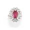 in oro bianco 18K, al centro rubino taglio ovale di ct 4,00 circa, contornato da diamanti taglio brillante e tapered baguette per totale ct 2,00 circa, prob. colore G/H, purezza VVS/VS.