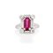 in platino, al centro rubino Birmano di forma ovale taglio misto di ct 1,50, contorno in diamanti taglio brillante e baguette.