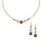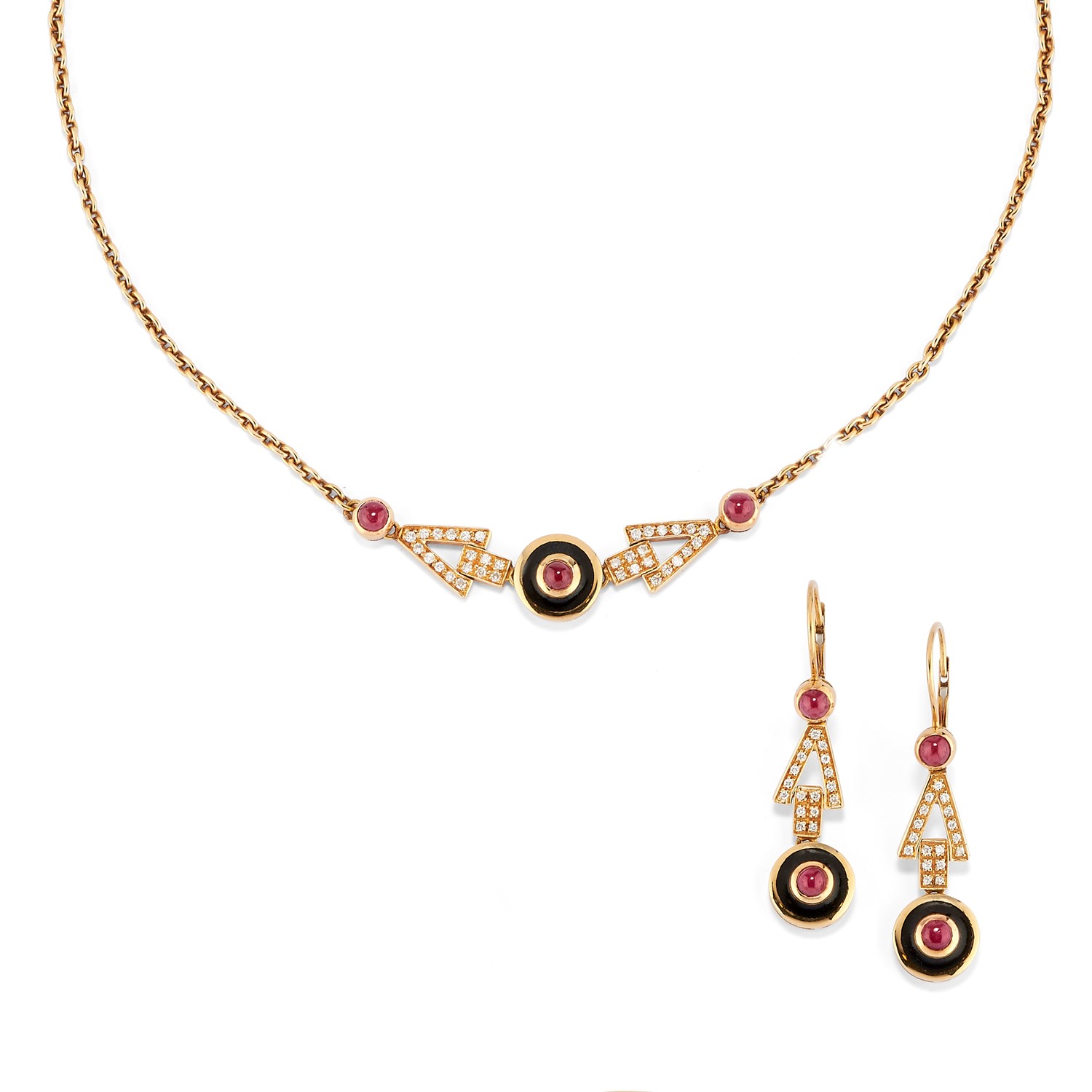 in oro giallo 18K, con diamanti, rubini taglio cabochon e onice, composta da collana e orecchini pendenti, con chiusura a monachella, a disegno geometrico.