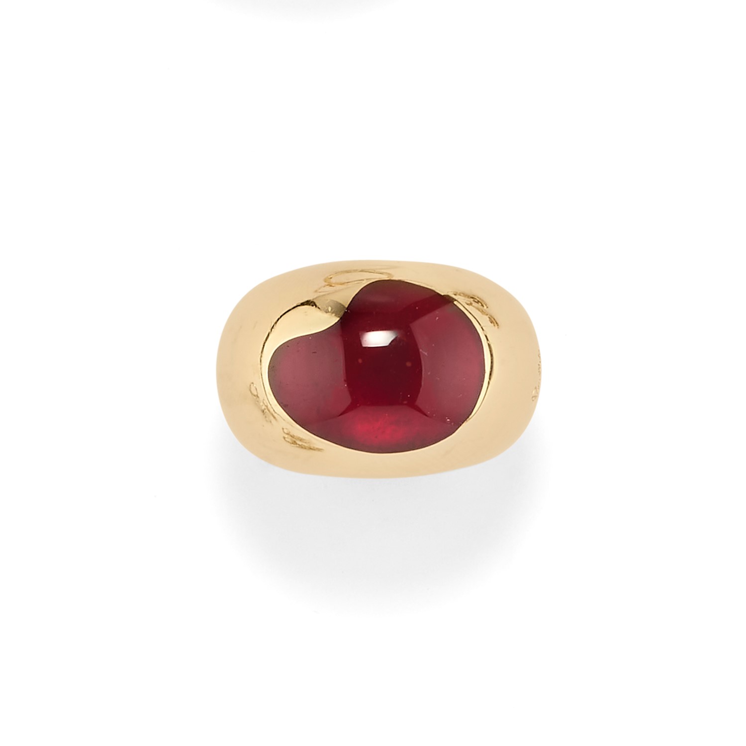 in oro giallo 18K e granato rosso taglio cabochon, collezione "Lago".