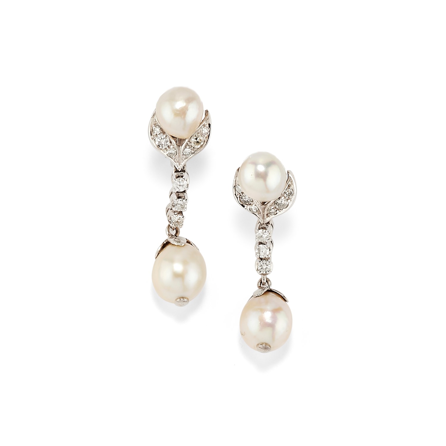 in oro bianco 18K, perle coltivate di mm 8,50/9,00 circa, diamanti taglio brillante e huit huit, chiusura con perno e clip.