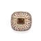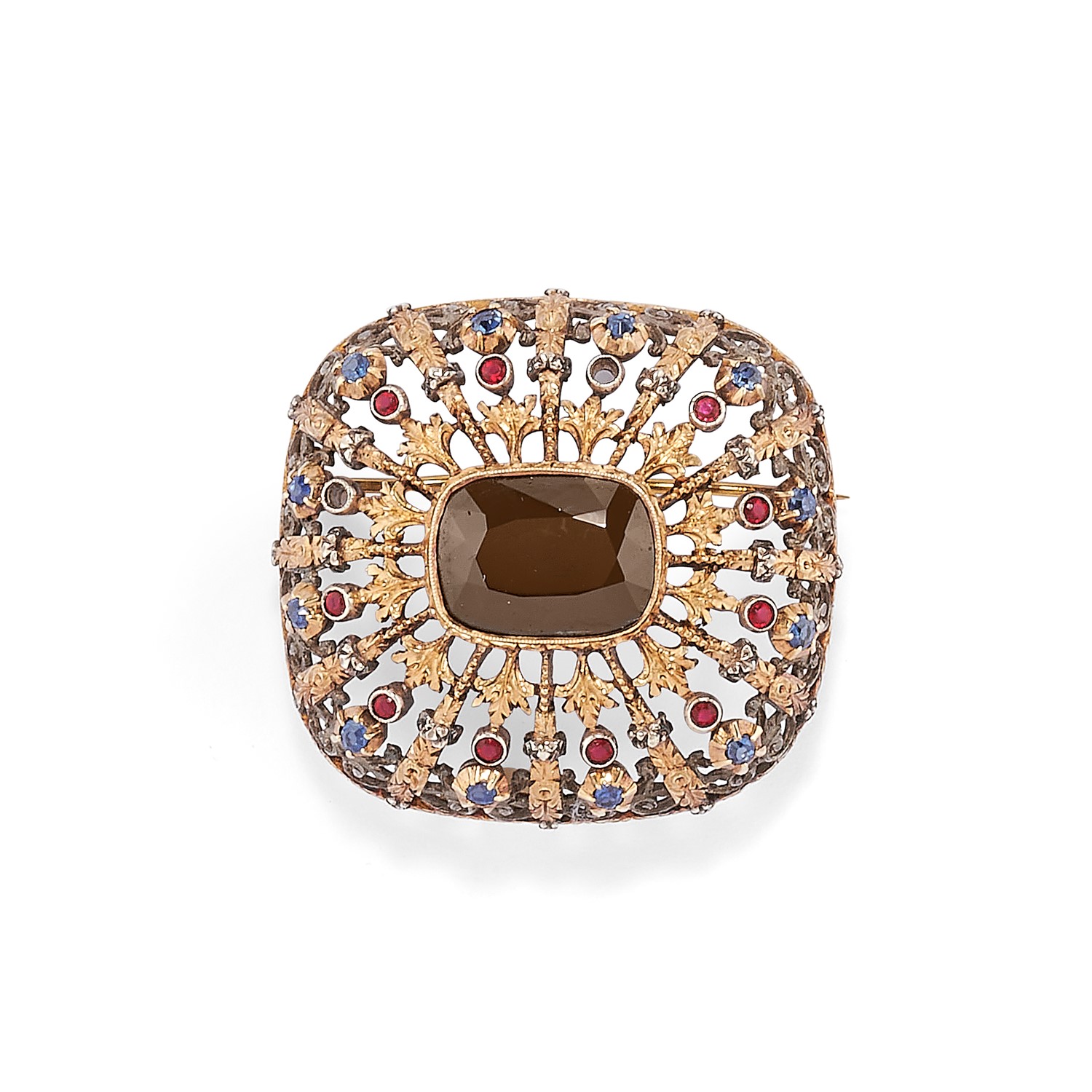 in oro, argento, al centro zaffiro taglio ovale di ct 10,00 circa, a rosone decorata con rubini taglio rotondo.
