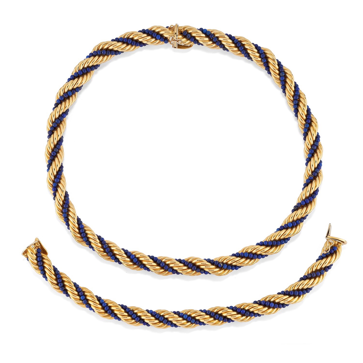 in oro giallo 18K, boules in lapislazzuli, a torchon, composta da collana e bracciale, unibili tra loro a formare una lunga collana.