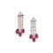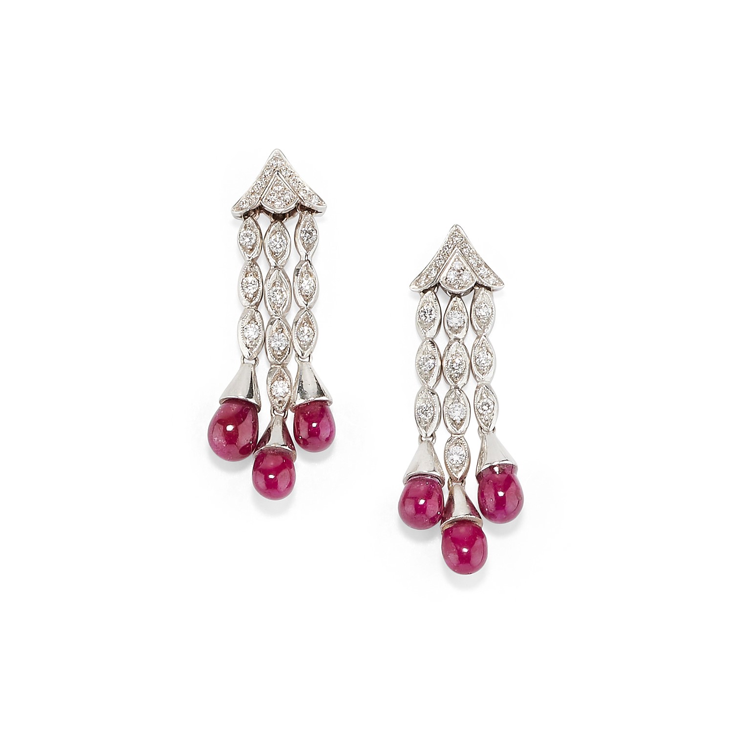 in oro bianco 18K, frangiati con terminali in rubini taglio goccia cabochon e diamanti taglio brillante per totale ct 0,80 circa.