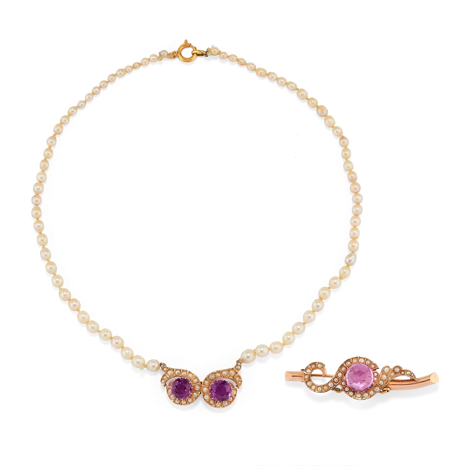 in oro rosa bassa caratura, perle coltivate e ametiste sfaccettate, composta da collana e spilla, difetti (al retro centrale della collana dissaldato).