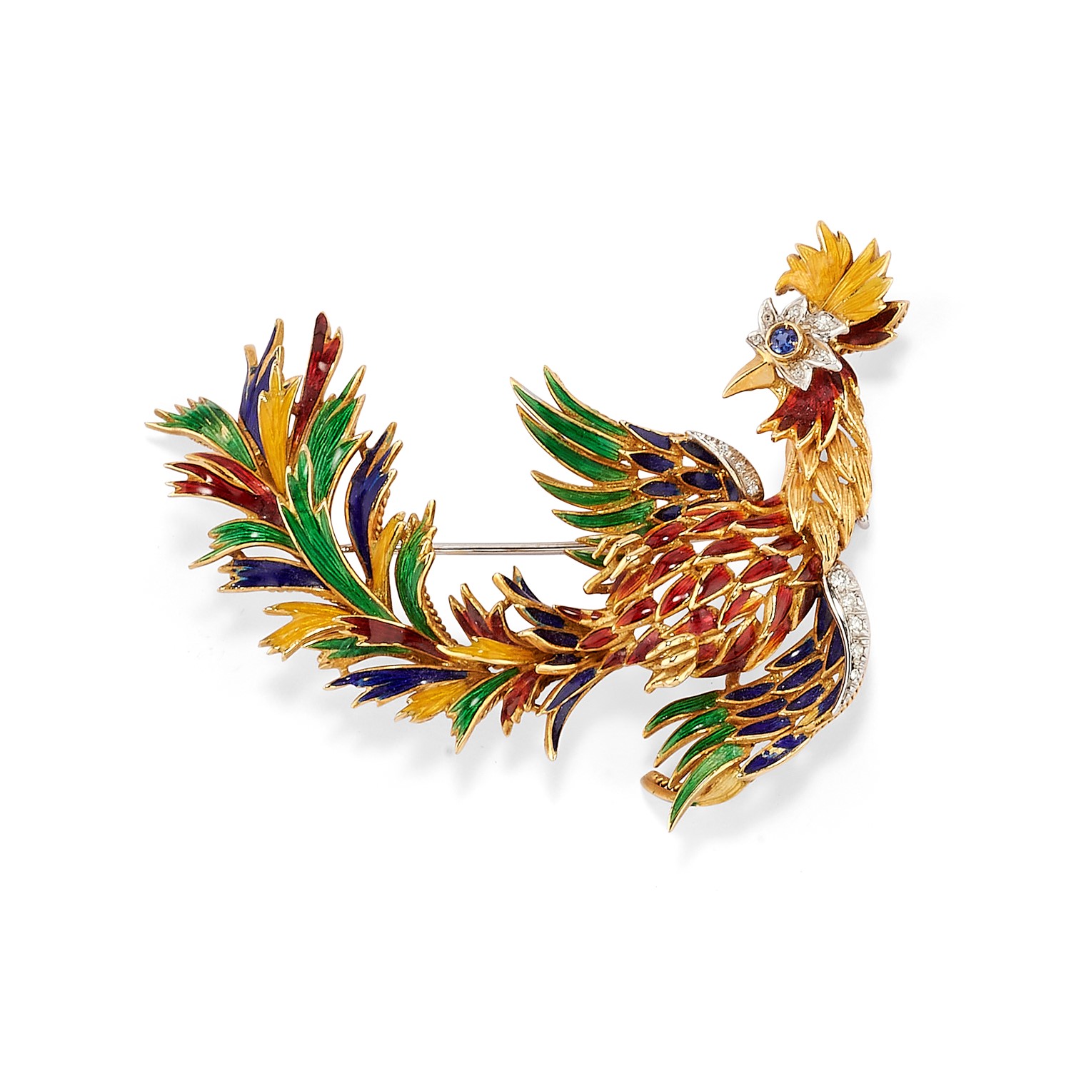 Spilla con smalti, diamanti e zaffiro, 1970 circa