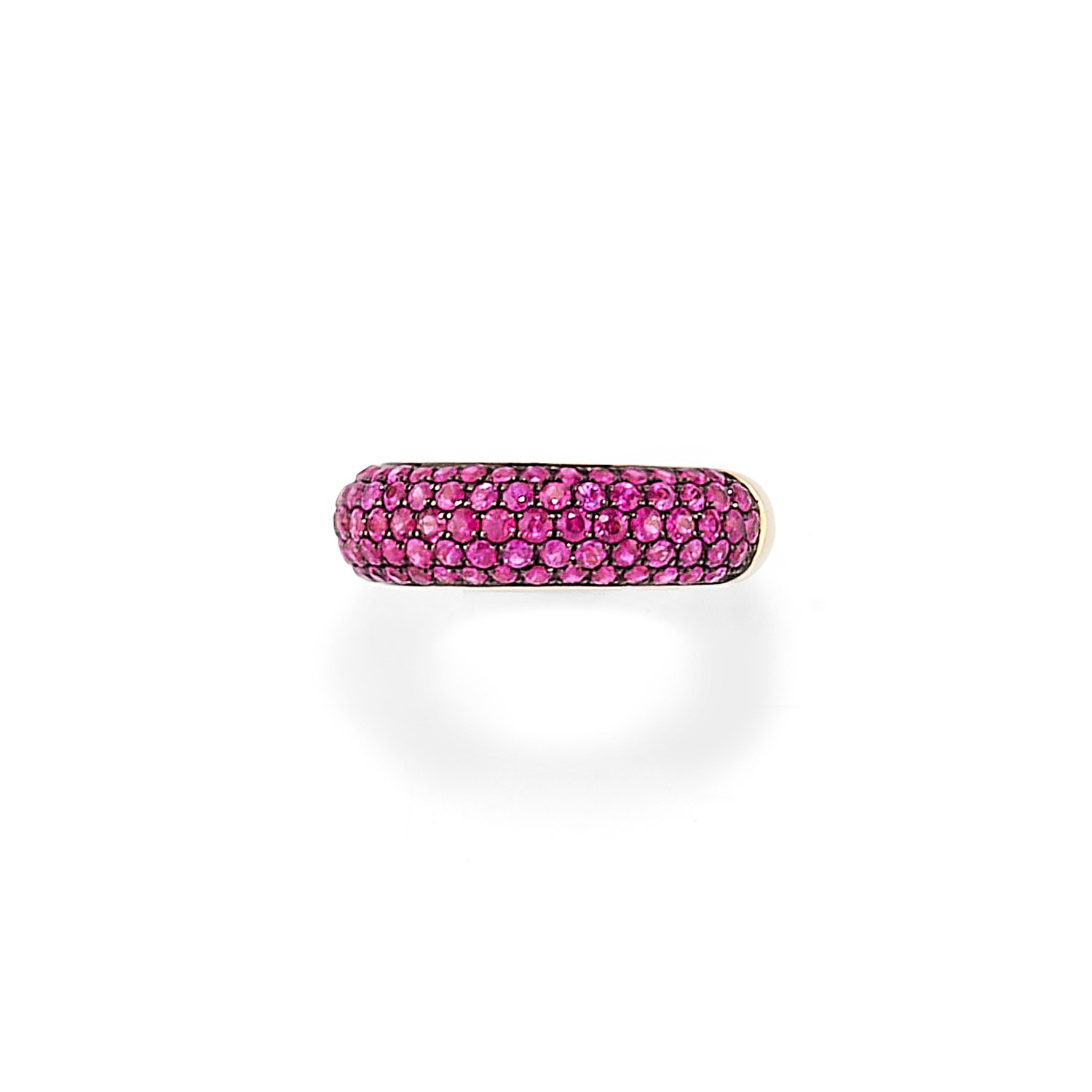 in oro giallo e brunito 18K, rubini taglio rotondo per totale ct 1,80 circa, a fascia bombata.