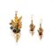 in oro giallo liscio e satinato 18K, di gusto floreale, composta da pendente/spilla e coppia di orecchini con chiusura a monachella, difetti (mancanza di materiale su alcuni turchesi).