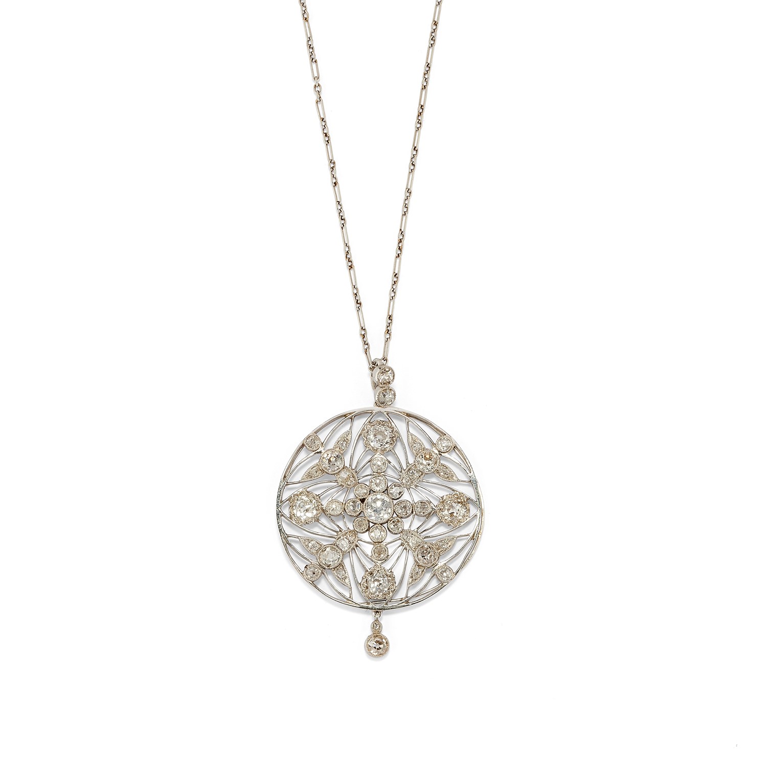 in platino e diamanti taglio vecchio per totale ct 3,00 circa, a rosone con decoro a milligrano.