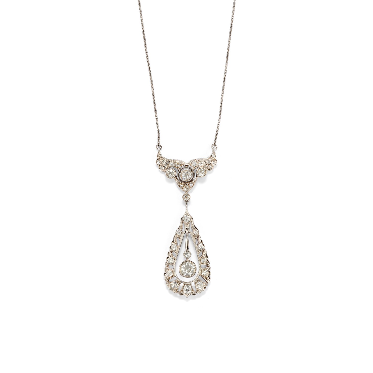 in platino, oro bianco 18K, pendente su perno oscillante decorato da diamanti taglio vecchio per totale ct 2,00 circa, con decoro a milligrano.