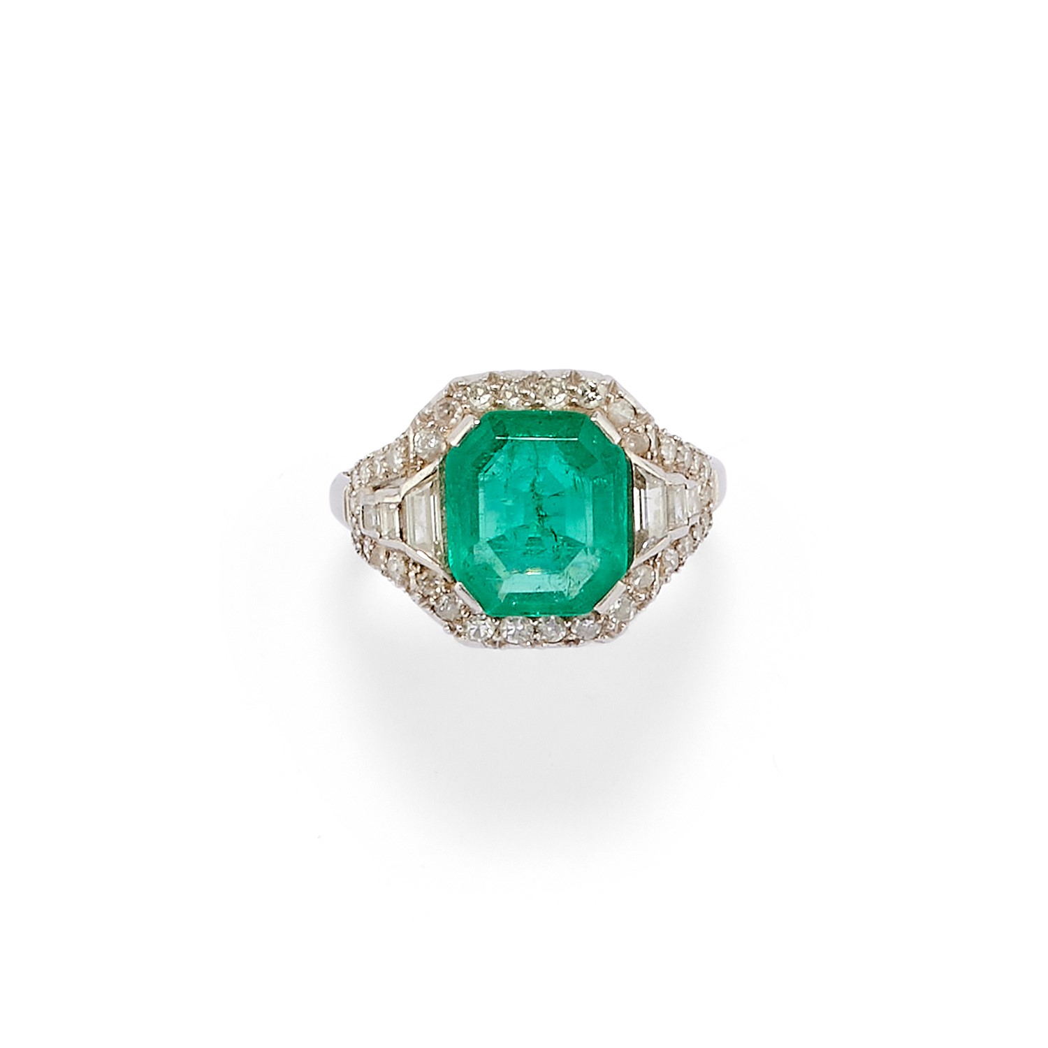 in platino, al centro smeraldo taglio rettangolare a contorno ottagonale di ct 3,70 circa, contorno in diamanti taglio huit-huit e tapered baguette modificato per totale ct 0,60 circa.