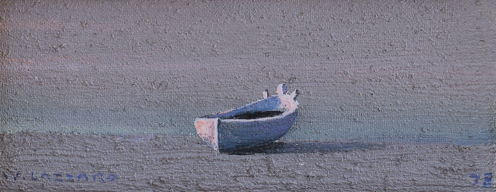 WALTER LAZZARO Roma 05/12/1914 - Milano 03/03/1989 Barca Bianca, 1978 olio su cartone telato cm. 6,7x17,2; firma in basso a sinistra, anno in basso a destra, dichiarazione d'autenticità della Arte Mercato su foto.