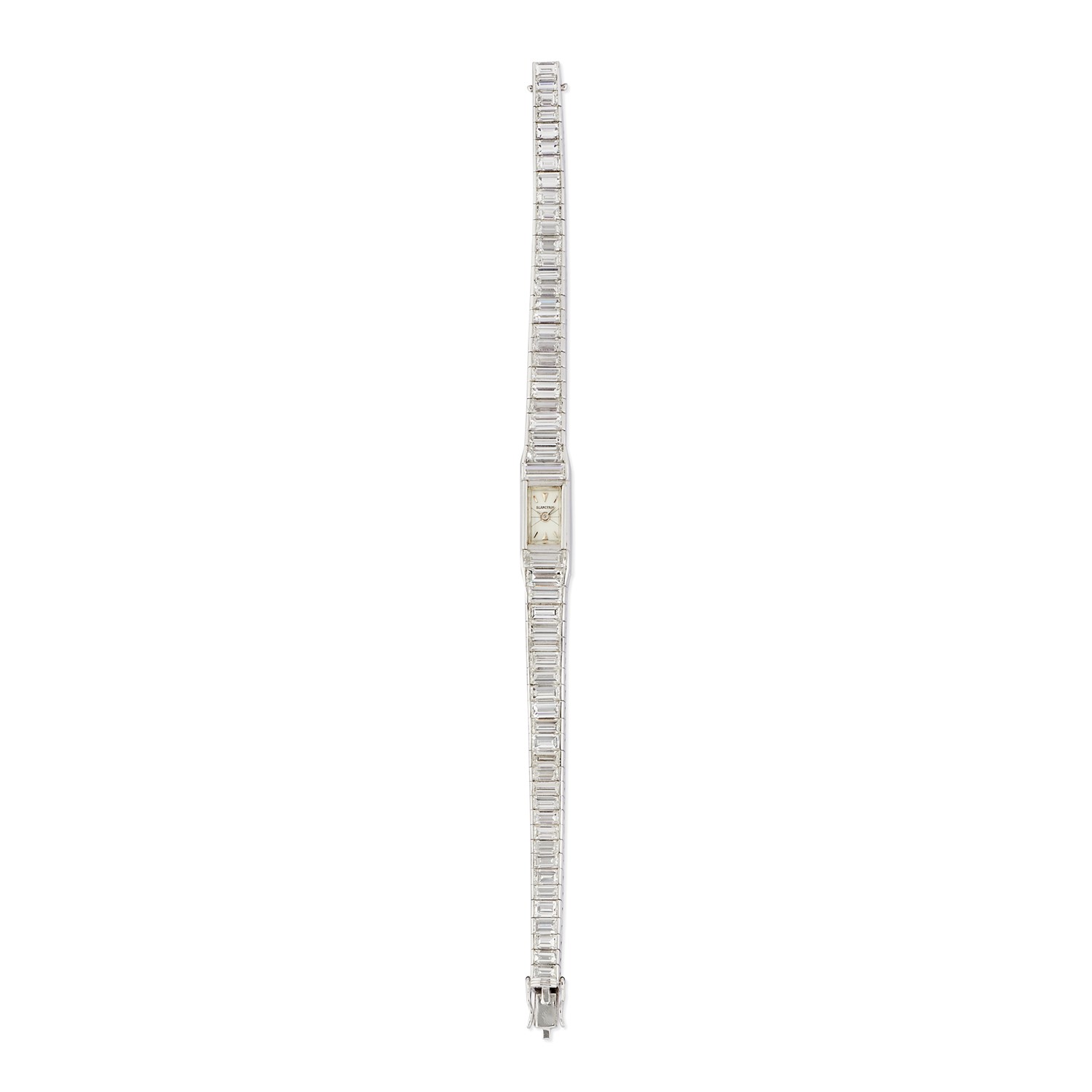 in oro bianco 18K, con corona sul fondello, quadrante bianco con indici applicati, di forma duo-plan cal. R59 "5 linee" a carica manuale, bracciale in oro bianco 18K composto da una fila di n. 54 diamanti lievemente degradée per ct 20,00 circa, quadrante, cassa e movimento firmati;