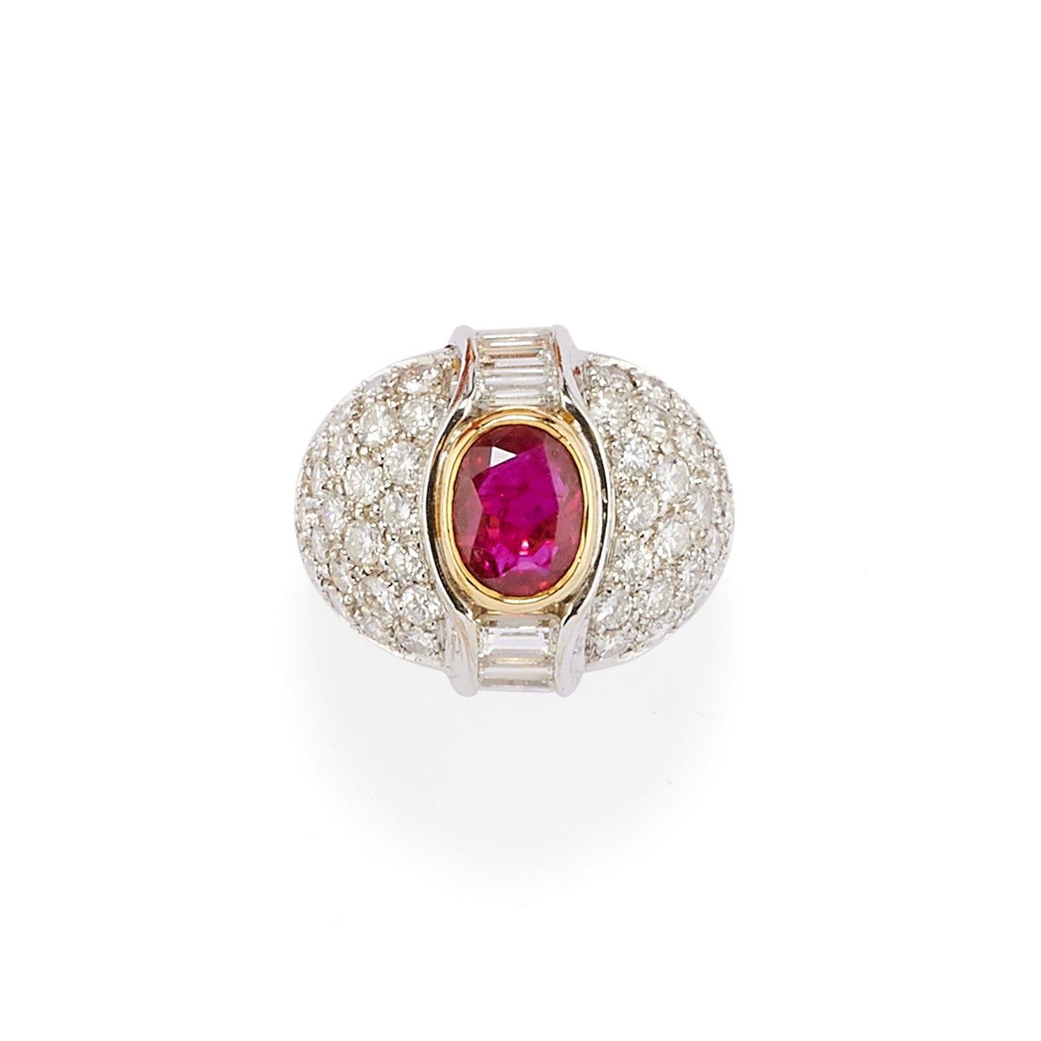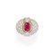 in oro giallo 18K, al centro rubino taglio ovale di ct 1,50 circa, contorno in diamanti taglio brillante e baguette per totale ct 2,00 circa.