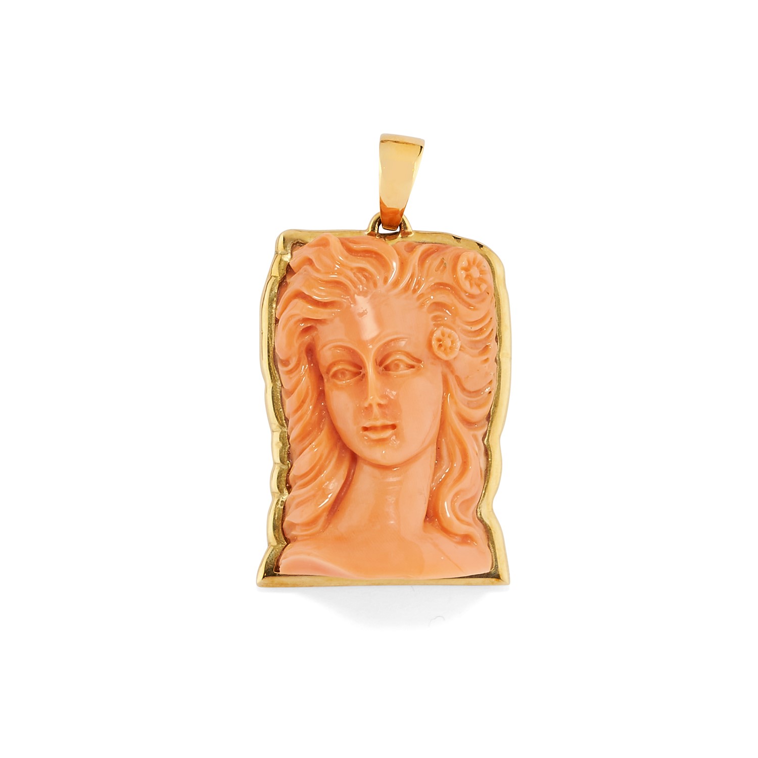 in oro giallo 18K e corallo scolpito a volto femminile.