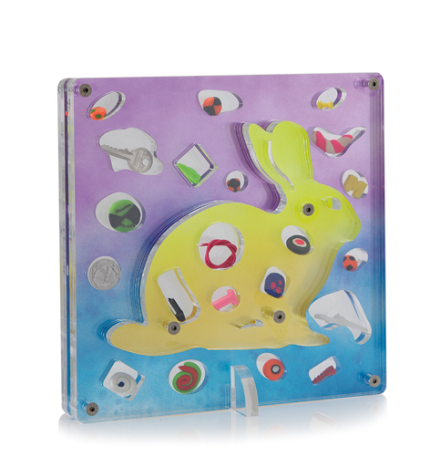 RENZO NUCARA Crema 1948 Stratofilm coniglio, 2011 assemblaggio di materiali plastici, resine, metalli e plexiglass cm. 30x30x5, firma, anno e numero d'archivio su un oggetto, dichiarazione d'autenticità dell'artista su foto, opera priva di cornice.