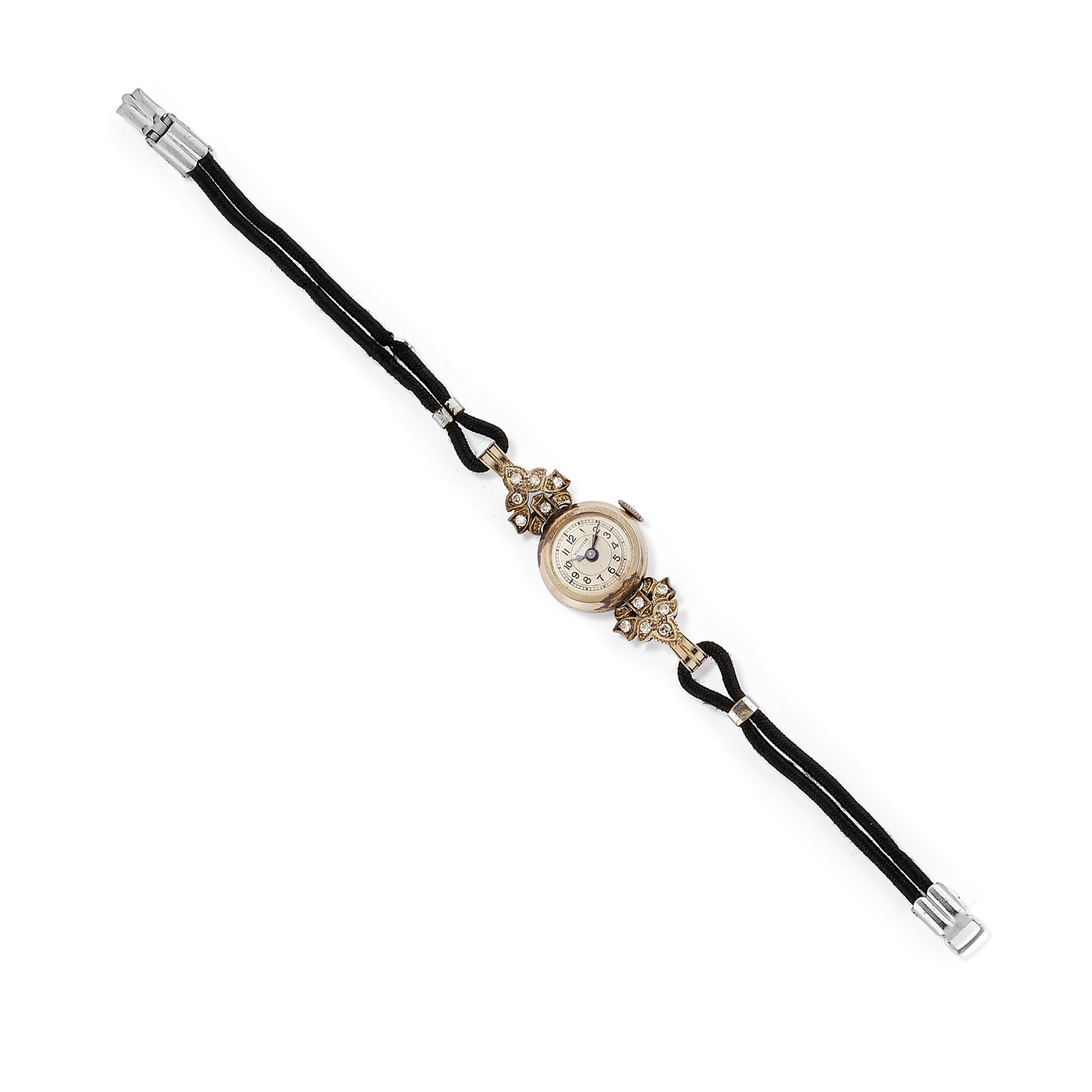con diamanti taglio huit-huit, cassa rotonda, quadrante chiaro con indici e numeri arabi in smalto nero, movimento a carica manuale, cinturino in tessuto nero con chiusura in metallo.