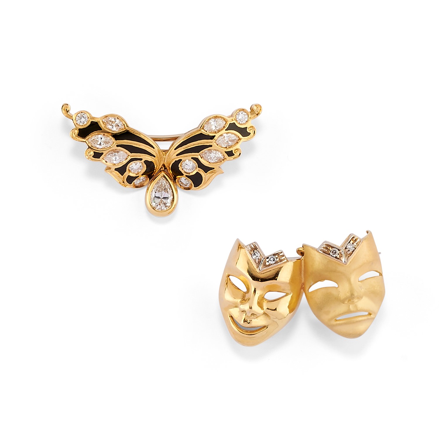 in oro giallo 18K, una con maschere, l'altra a farfalla con smalto nero e diamanti taglio goccia, navette e brillante per totale ct 1,50 circa.
