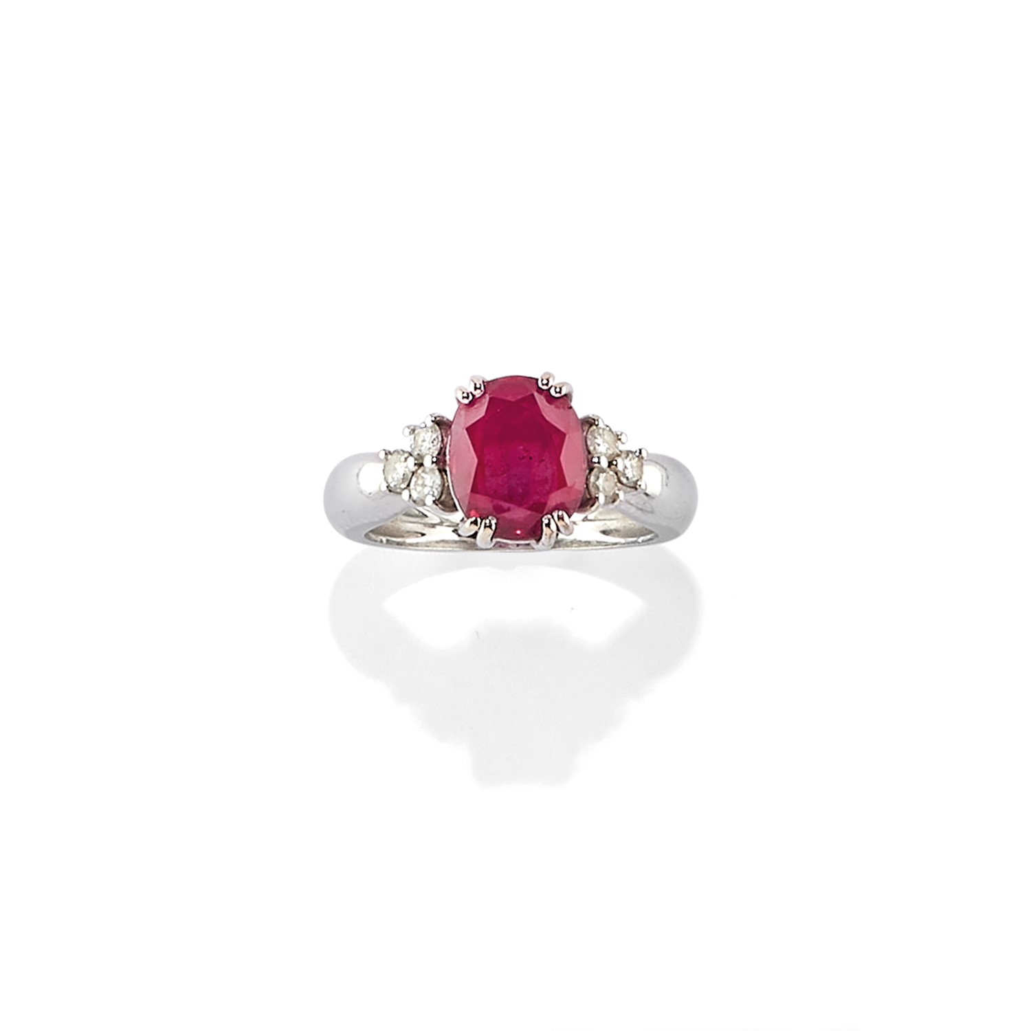 in oro bianco 18K, rubino taglio ovale di ct 1,00 circa e diamanti taglio brillante per totale ct 0,20 circa.