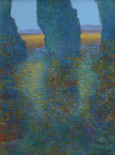 JOHN PICKING Lancashire (Inghilterra) 1939  Giardino acquatico II, 1996 olio su tela cm. 80x60, firma, titolo, anno e archivio dell'artista al retro, Archivio John Picking su foto, certificato della Telemarket (BS) allegato.