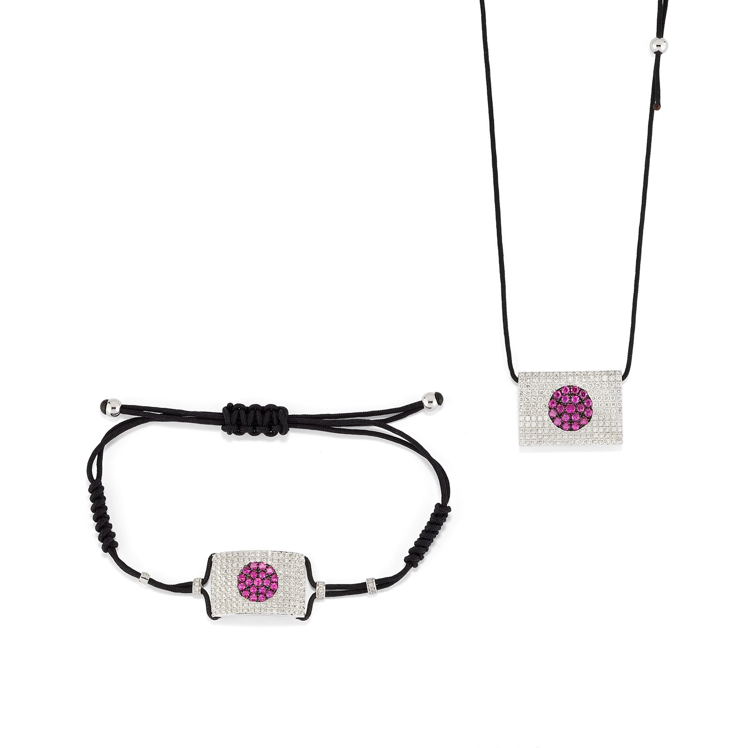 in oro bianco 18K e cordoncino nero con chiusura scorrevole che trattiene pendente di forma rettangolare con pavè di diamanti per totale ct 2,10 circa, rubini per totale ct 1,00 circa, composta da collana e bracciale, raffigurante bandiera giapponese.