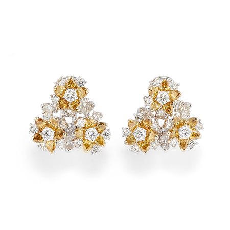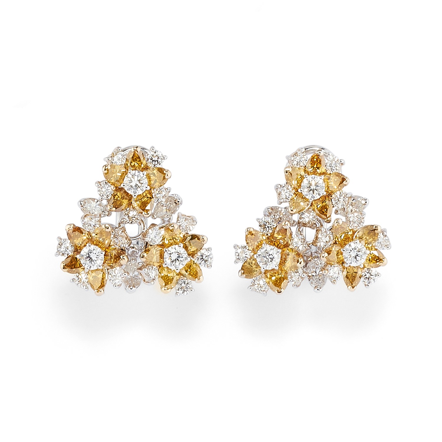 in oro bianco 18K, a tre fiori en tremblant in diamanti Fancy Orange taglio marquise per totale ct 4,90 circa, diamanti incolori taglio brillante e marquise per totale ct 3,70 circa, prob. colore G, purezza VS, chiusura con perno e clip.