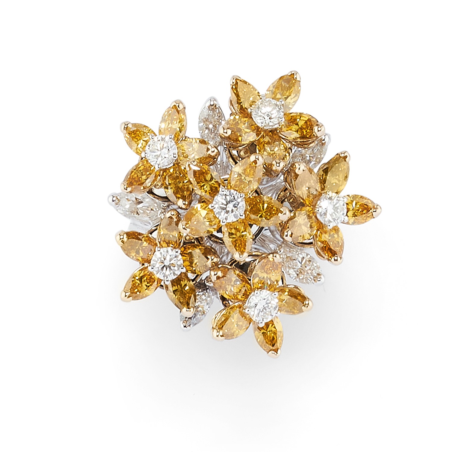 in oro bianco 18K, con sei fiori en tremblant in diamanti Fancy Orange taglio marquise per totale ct 6,45 circa, diamanti incolori taglio brillante e marquise per totale ct 1,80 circa, prob. colore G, purezza VS.