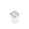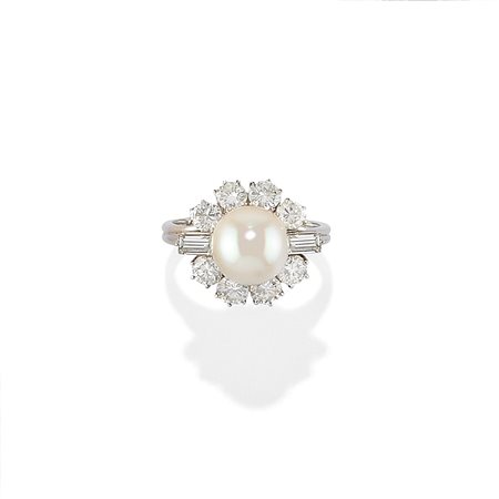 in oro bianco 18K, al centro perla coltivata di mm 9,00 circa e petali in diamanti taglio brillante e baguette per totale ct 1,50 circa.