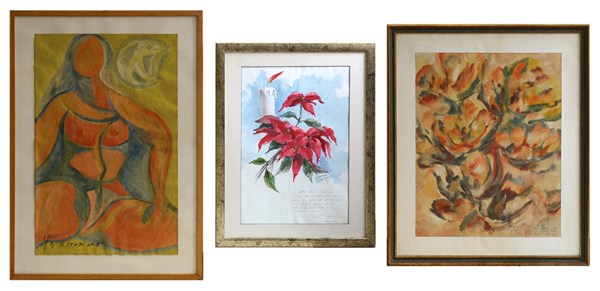 Lotto composto da tre tecniche miste su carta raffiguranti fiori e figure, di a