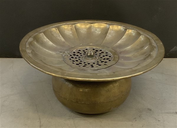 Arte islamica, braciere in ottone con corpo martellato, parte superiore baccellata con sportellino traforato (d cm 56, h cm 25) (difetti)