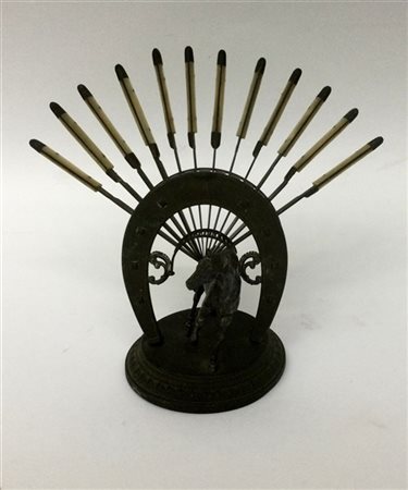 Portacoltelli in metallo decorato con cavallo a tutto tondo e ferro di cavallo, completo di dodici coltellini con manici in madreperla (cm 25x23) (difetti)