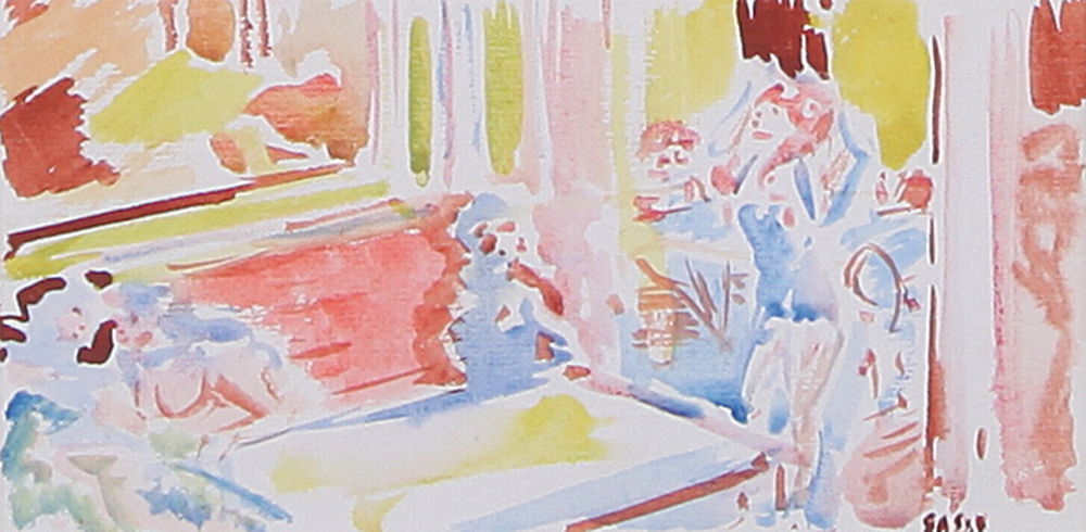 ALIGI SASSU Milano 17/07/1912 - Palma di Maiorca 17/07/2000  Apparizioni, Maison Tellier, 1991 acquerello su cartoncino cm. 10,5x21,5; firma in basso a destra, firme, titolo e anno al retro, dichiarazione d'autenticità della Galleria La Scaletta (RE) su foto, opera registrata presso l'Archivio dell'artista come da dichiarazione su foto.