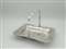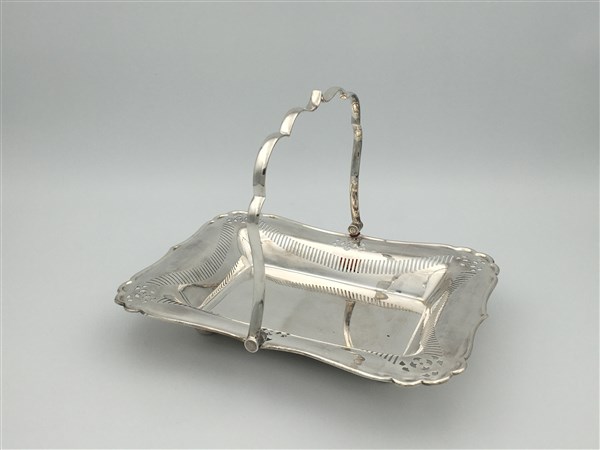 Cestino in metallo argentato con bordo mosso traforato e manico a volute, su pi